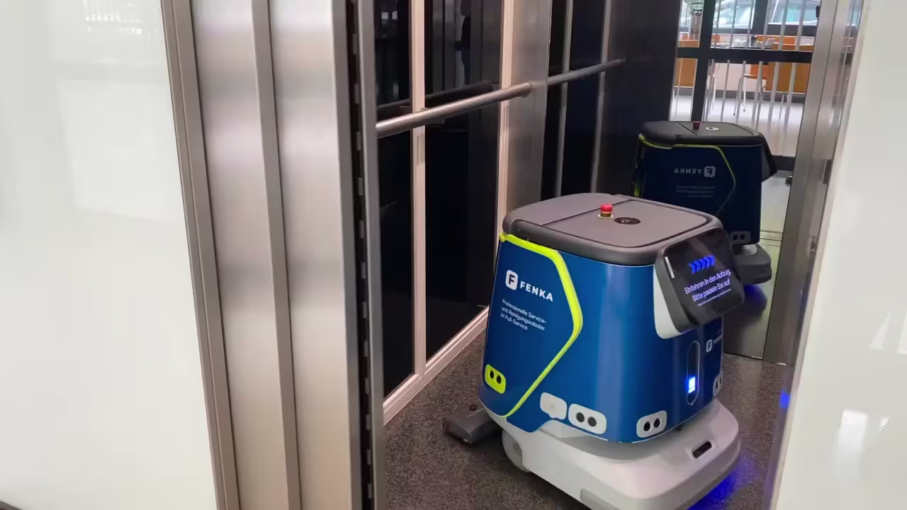 Die Kommunikation zwischen dem FENKA Roboter und der Aufzugstechnik funktioniert tadellos. Der Roboter fordert den Aufzug an, betritt die Kabine, wählt die Etage und verlässt den Aufzug am Zielort sicher.